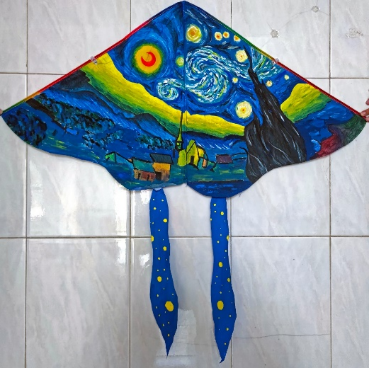 飞卷的星云,闪烁的星月,跳动的黑色火舌,重叠的山峦和森林,若隐若现的村庄。浓厚有力的色彩在流转和交融,是心灵在挣扎与苦苦寻求,还是从现实形体中剥离的意识在涌动?无限的,流动的,生长的,正如我们对生命的外延和内涵的探求。就让风筝带着我无边的思绪与想象放飞吧!
