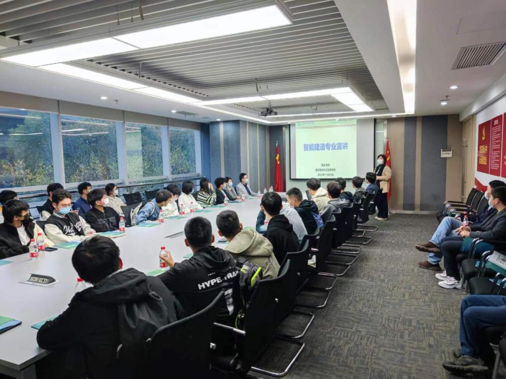 参观结束后,师生共同进行了智能建造专业宣讲交流会,数字建造与工程管理系周迎教授从“学什么”、“会什么”、“怎么学”等多个维度为同学们勾勒出智能建造专业的学习框架。系主任周诚教授表示我校智能建造专业拥有院士领衔的国际一流师资团队和全方位国际合作教学科研资源,汇聚了国家战略科技力量和专业优势资源,能够为同学们提供丰富的科研创新项目和实践机会。最后,党委副书记何春老师总结发言,她勉励同学们以我院“胡吉伟班”——智能建造2001班为榜样,结合参观所见所想,认真思考学习规划,找准自身发展目标,力争在智能建造专业平台上绽放光彩。