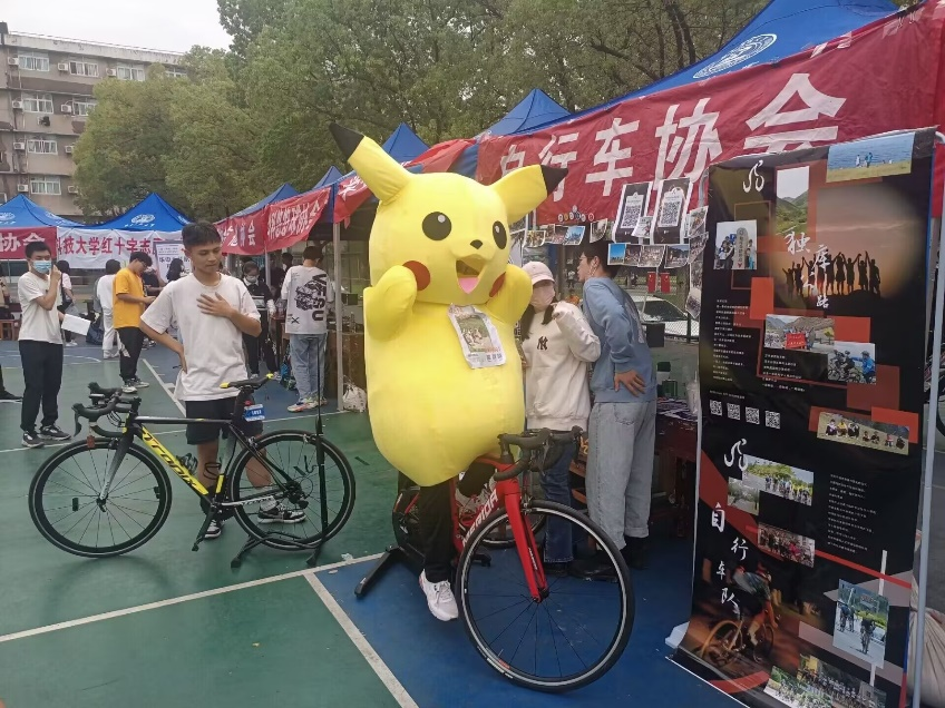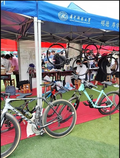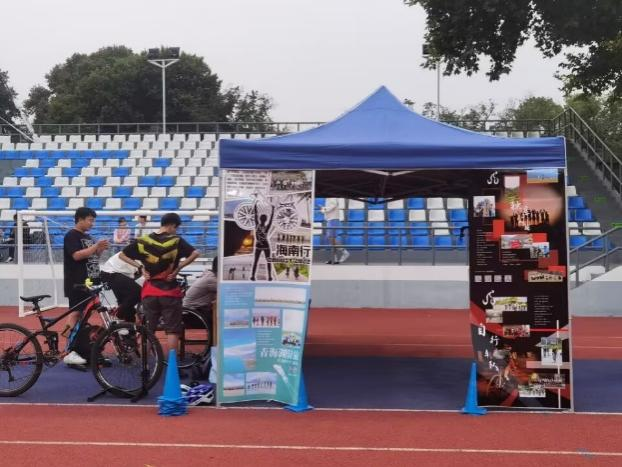 在各主题展区,社团展位上人流涌动,自行车协会的山地车绕障碍骑和公路车功率大比拼的活动也在如火如荼的进行。只见同学们小心翼翼的骑着自行车在复杂的障碍中穿行,有的同学一气呵成,引来围观同学的阵阵喝彩,也有的同学出现了小失误,周围的同学也及时送上自己的帮助与鼓励;而在另一边的功率大比拼中,大家体验了骑行台骑行,在一阵又一阵的加油喝彩声中,许多同学突破了自己,获得了瞩目的成绩。此外,我们拉起横幅,挂起照片,向过往的人们讲述自行车协会故事,原来自行车不止有竞速,也有浪漫与自由。