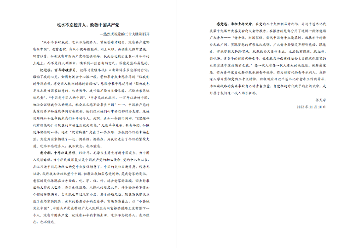 获奖作品主题鲜明,有较强的时代性、艺术性和可读性,展示出现代中国青年党员的思想深度和家国情怀。虽然本次主题征文比赛至此告一段落,但作为新时代新青年,我们应继续用努力践行,用脚步丈量党的二十大精神,用自己的行动礼赞二十大。